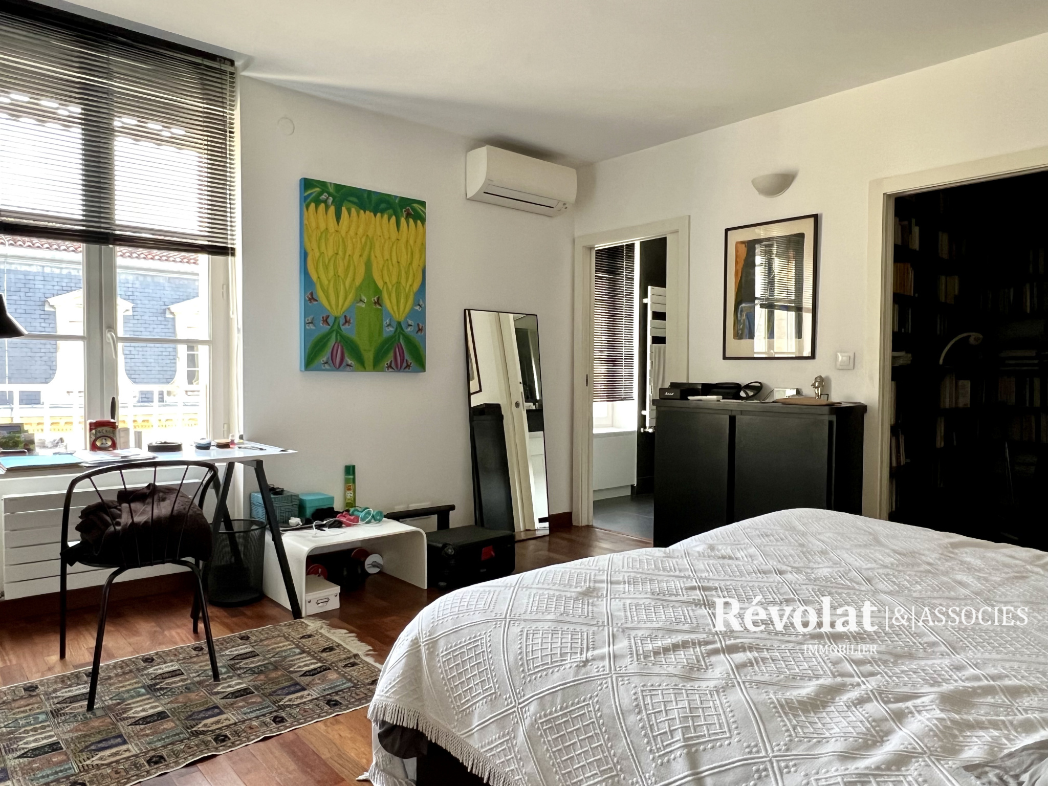 Dans un magnifique immeuble pierre entièrement réhabilitée avec ascenseur et parking, magnifique appartement climatisé au quatrième et dernier étage entièrement rénové avec des matériaux de très grande qualité. Au premier niveau grand salon / salle à manger lumineux avec une très belle vue sur les toits de Bordeaux, cuisine semi indépendante toute équipée, un espace bibliothèque nous amène dans une immense chambre avec dressing et salle d'eau privée, toilette indépendant. A l'étage un bureau ouvert sur séjour, une grande chambre, une chambre transformé en dressing, salle d'eau avec toilette. Parking intérieur et cave complètent ce bien exceptionnel.